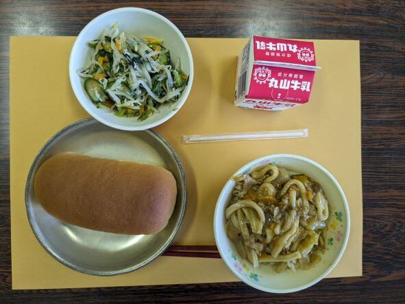 今日の献立は、焼きうどん、梅肉和え、コッペパン、牛乳です。焼きうどんは、ソース味で、豚肉、キャベツ、人参、タマネギ、ネギなどの具がたくさん入っており、野菜も軟らかく煮てあり、子どもたちにも食べやすくなっています。ソースの風味が食欲をそそってとてもおいしかったです。