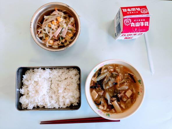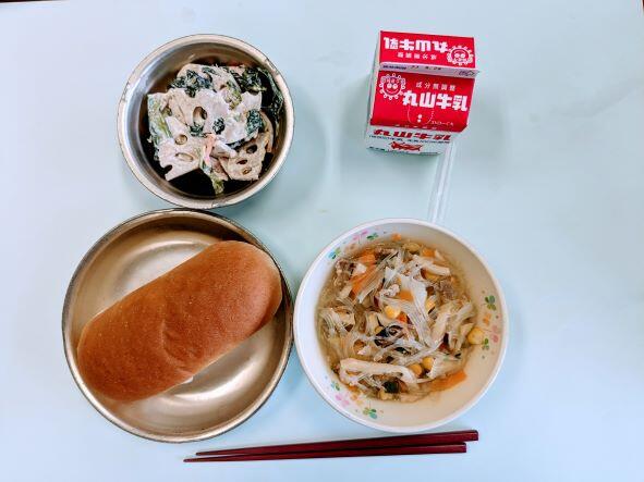 今日の献立は、太平燕、れんこんのからし風味マヨネーズ和え、コッペパン、牛乳です。