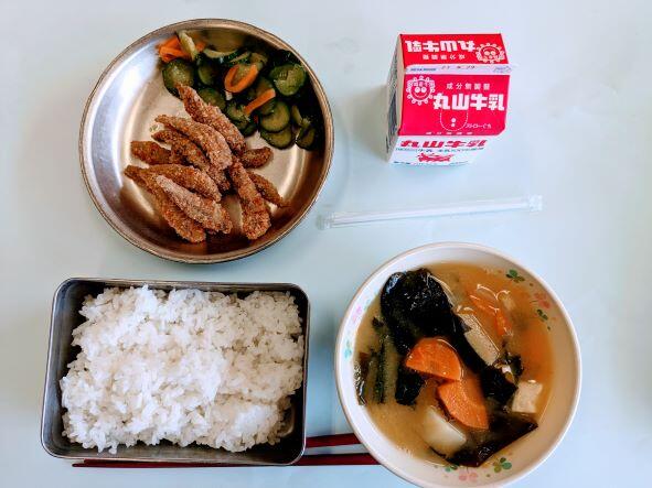 今日の献立は、鰯の梅の香揚げ・添え野菜、カボチャの味噌汁、ご飯、牛乳です。