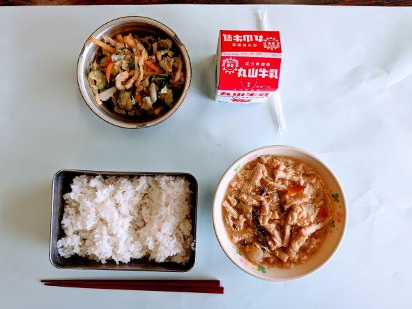 今日の献立は焼き肉ふう炒め、わかめスープ、ご飯、牛乳です。焼き肉ふう炒めはたくさんの野菜とお肉が入っていて、白ご飯にばっちり合っていて、とってもおいしかったです。今日は5年生が田植えでしたので、さぞかし、給食がおいしかったことでしょう。