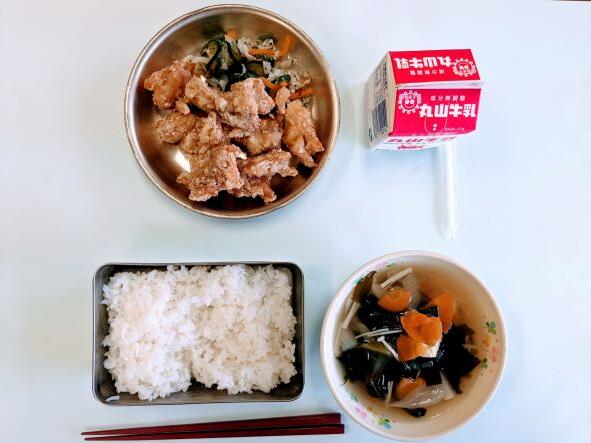 今日の献立は、唐揚げ、添え野菜、すまし汁、ご飯、牛乳です。唐揚げは、ショウガやニンニク、こしょうや醤油での味付けが抜群で、揚げ方もからっとしていて、とてもおいしかったです。ご飯をおかわりしたくなるくらいおいしかったです。