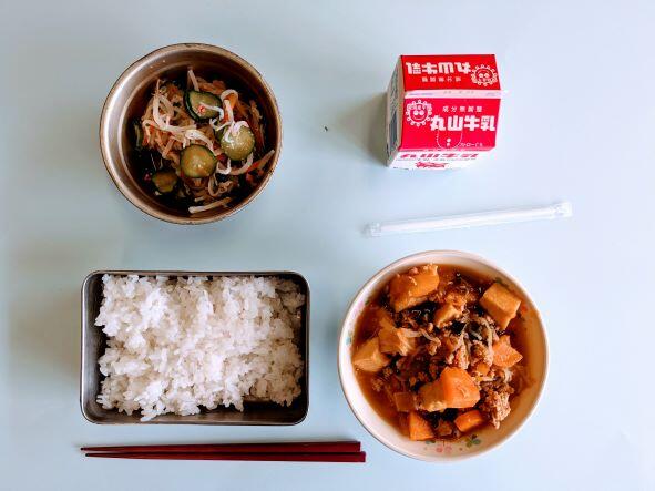 今日の献立は、カボチャのそぼろ煮、ちりめんときゅうりの酢の物、ご飯、牛乳です。