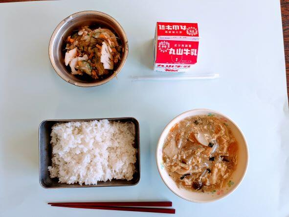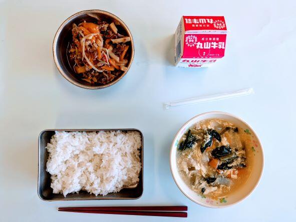 今日の献立は、ニラ玉スープ、青椒肉絲、ご飯、牛乳です。中華の青椒肉絲が少し辛めで白ご飯と合って、食欲が増します。ニラ玉スープは少し熱かったですが、さっぱりとしたスープでおいしかったです。