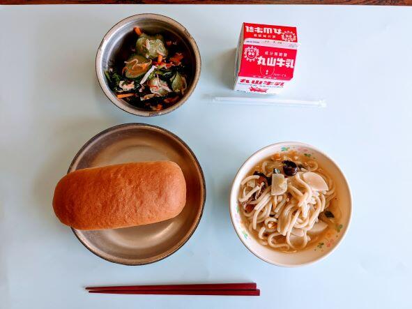 今日の献立は、ちゃんぽん、中華風酢の物、コッペパン、牛乳です。ちゃんぽんは、様々なものを混ぜるという意味の言葉であり、そのような料理の名称でもあります。特に長崎のちゃんぽんが有名ですが、ちゃんぽんという料理は全国各地にあるそうです。