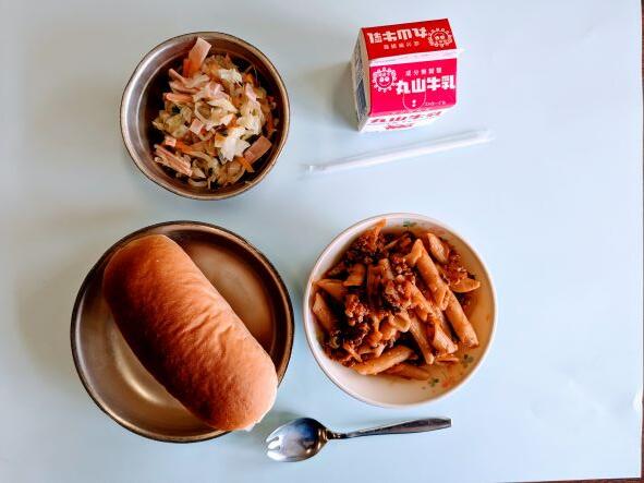今日の献立は、ペンネボロネーゼ、ハムサラダ、コッペパン、牛乳です。ハムサラダは酢がきいていてさっぱりして、とてもおいしかったです。ペンネボロネーゼは、挽き肉が入ったデミグラスソース味で子どもたちも好んで食べる味でした。とってもの濃厚で食欲もわいてきました。
