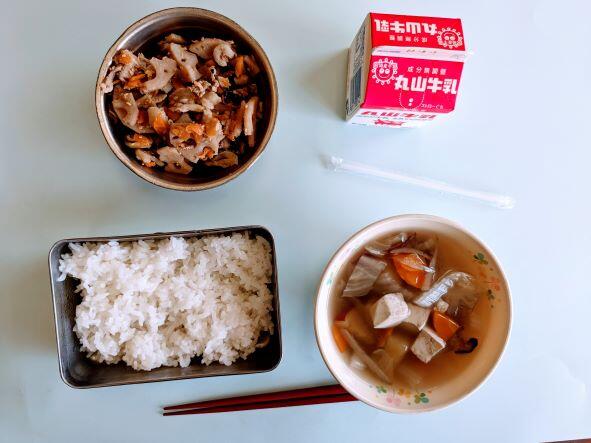 今日の献立は、レンコンと豚肉のピリ辛炒め、根菜汁、ご飯、牛乳です。レンコンのサクッとした感触と豚肉が入ってぴりっとした辛さが子どもたちにちょうど良いくらいで、とてもおいしかったです。