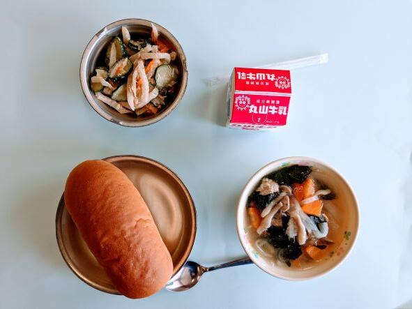 今日の献立は、肉団子スープ、大根サラダ、牛乳、コッペパンです。肉団子スープは野菜と肉の出汁がしっかりと出ていて,熱かったですがとてもおいしかったです。大根サラダは大根を食べやすいように細長に切っていて、ごまドレッシングで和えていて、とてもおいしく感じました。