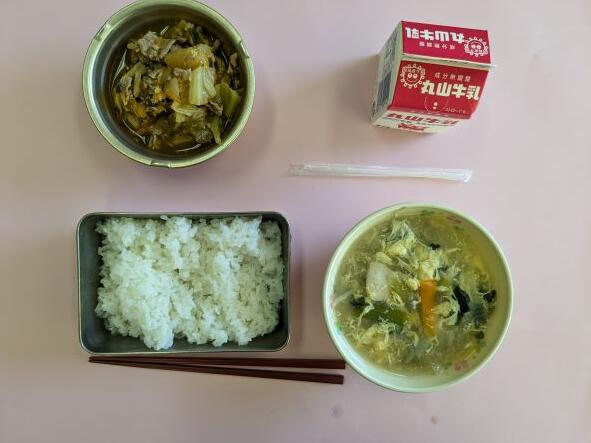 今日の献立は、タコライス、ゆでキャベツ、もずくスープ、牛乳です。タコライスはタコスの具材を米飯の上にそせた沖縄県の料理です。沖縄県では1990年代から学校給食として採用されているそうです。子どもたちにも食べやすい、トマト味で少し辛みもありますがとってもおいしかったです。もずくスープもとろみがあり、いろいろな野菜の具がたくさん入り、おいしかったです。