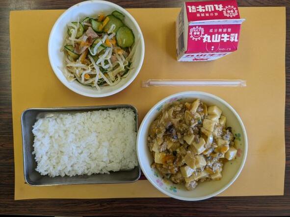 今日の献立は、麻婆豆腐、焼き豚ともやしの中華和え、ご飯、牛乳です。麻婆豆腐は、少しピリ辛でご飯にぴったりで、食欲も増しました。これから暑くなり食欲も下がりますが、残さず食べてほしいと思います。