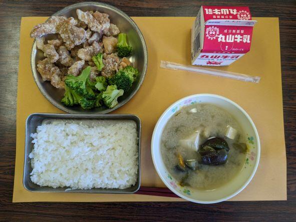 今日の献立は、唐揚げ添え野菜、なすの味噌汁、ご飯、牛乳です。今日は子どもたちが大好きな唐揚げとブロッコリーです。からっと揚げられていて、ご飯と相性抜群!しょうがやニンニクの味付けで食欲もアップしました。とてもおいしかったです。