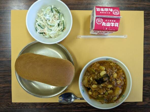 久しぶりのカレーライス、スパイスがきいてとてもおいしかったです。フルーツナタデココも子どもたちが大好きなメニューです。今日は残菜が少なかったことでしょう。