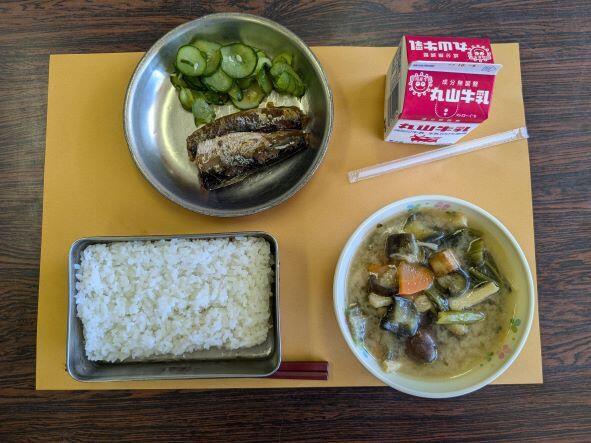 今日の献立は、いわしのおかか煮、添え野菜、なすの味噌汁、ご飯、牛乳です。いわしのおかか煮は骨まで柔らかくなるまで煮てあり、子どもたちも骨を気にせずに食べられるので安心です。ご飯がさらにおいしく感じました。