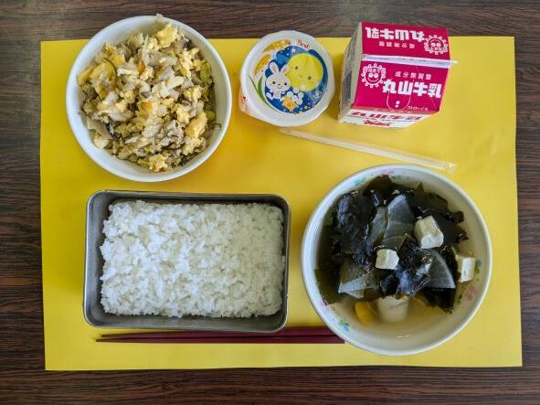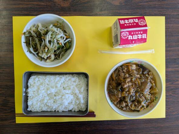 今日の献立は、麻婆なす、茎わかめの中華和え、ご飯、牛乳です。茎わかめの中華和えは食物繊維たっぷりで酢味でさっぱりしておいしかったです。麻婆なすもしっかりと煮込んでいてとても濃くおいしかったです。