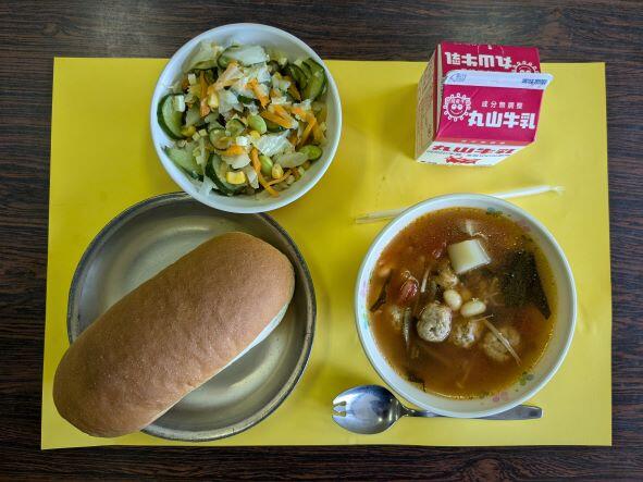 今日の献立は、肉団子のトマトスープ、コロコロチーズサラダ、牛乳、コッペパンです。