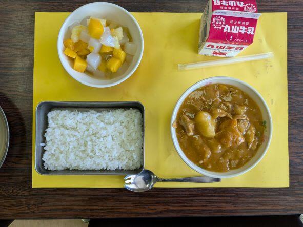 今日の献立は、ポークカレー、フルーツナタデココ、ご飯、牛乳です。蒸し暑い日にはやっぱりカレーですね。豚肉やジャガイモなど具がたっぷり入ったポークカレーは食べ応えがあって、食欲が増しました。フルーツナタデココも冷たくて、とてもおいしかったです。午後の運動会の作業でがんばれます。
