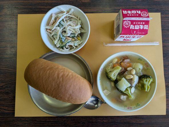 ジャガイモのポトフはいろいろな具材からの出汁がしっかり出て、とてもおいしく、ヘルシーなメニューでした。子どもたちがしっかりと噛んで食べるよう、今日はカミカミメニューとしてゴボウのハムマヨサラダが登場しましたが、虫歯治療中の私にとってはちょっと大変でした。子どもたちはしっかり噛んで食べたことでしょう。