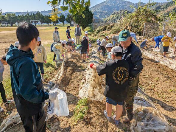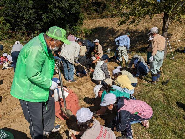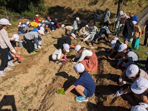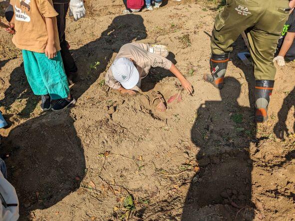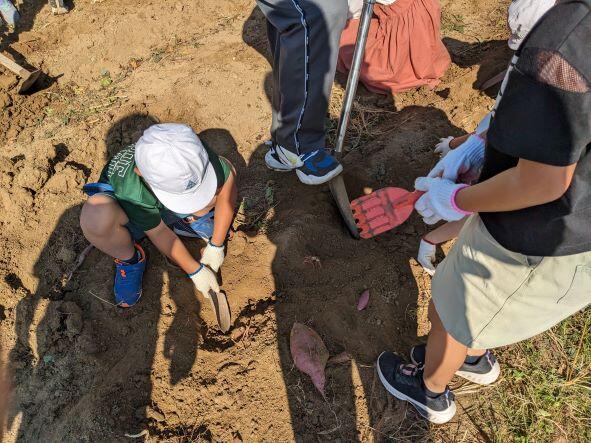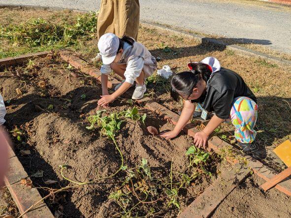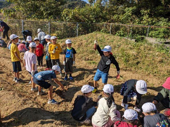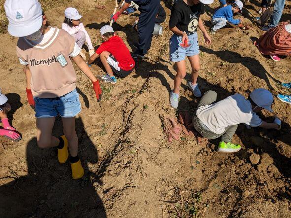 2年生が地域の方々の協力をいただきながら、芋掘りを行いました。まずはじめに地域の皆さんに「よろしくお願いします!」と元気よくあいさつをしてから、芋畑に張られているマルチのビニールをみんなではがしました。そして、芋の茎が出ている場所に陣取り、一斉に芋掘りが始まりました。ここ最近雨がほとんど降ってなかったので、土がかなり堅く、子どもたちは悪戦苦闘していました。地域の方々に応援をもらい、お芋の横側を鍬で掘り起こしてもらって、芋が取りやすくなりました。2年生もとても大きなお芋がとれて、とても大喜びでした。次回のお芋パーティーが楽しみですね。