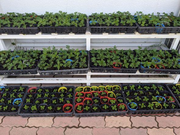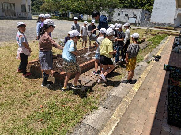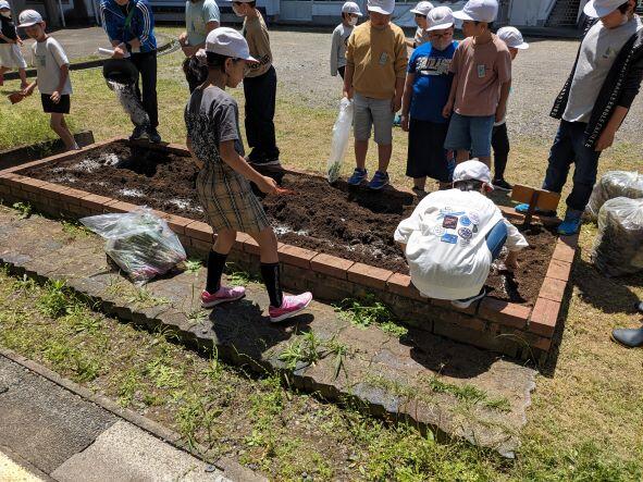 春の花のシーズンが終わり、花壇の花を抜き、石灰や肥料を撒きました。今日は4年生がその作業を行っていました。次の花の準備もばっちりで、マリーゴールドやサルビアの苗がすくすくと育っています。夏の花も楽しみです。