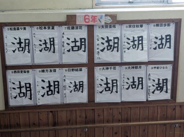 6年生の掲示板には習字の作品が展示されています。【湖】が書かれていました。さんずいの形や古いの口の形、月のはらいなどが難しいですが、みんな上手に書かれてあってすばらしいです。