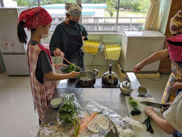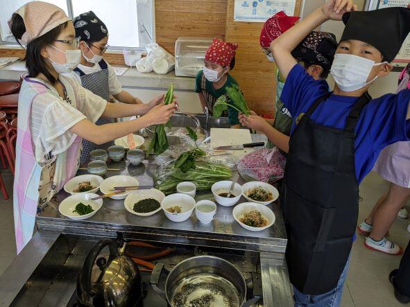 今日は5年2組がほうれん草のおひたしを作っていました。しっかり鍋で湯がいて、冷ましたほうれんそうを軽く絞って水気をなくし、5cm位の幅に切って、鰹節をかけ、醤油で味付けして、とても上手にできていました。作ったおひたしは、5年生からいただきました。とてもおいしかったです。