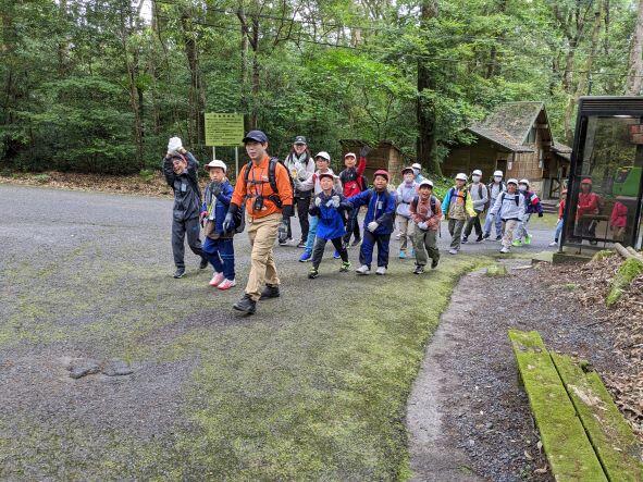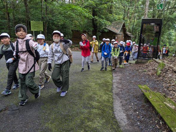 5年生はむかばき青少年自然の家に着き、9時半から行縢山の雄岳を目指して、登り始めました。行縢神社の横を通り、石や岩がごろごろしている登山道を頑張って登っていました。頂上ではおいしいお弁当が待っています。我慢強く頑張ってほしいと思います。
