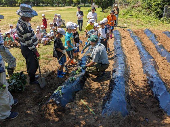今日は2年生が芋植えを行いました。今年は子どもたちも、畝つくり、マルチ張り、苗植えを地域の協力者と一緒に行いました。子どもたちは協力者の話を聞いて、3つの行程をしっかり頑張りました。時間が結構かかるかな?と思いましたが、やる気満々、時間内に完了することができました。昨年度までは苗を植えるだけでしたので、子どもたちお客さん状態でした。しっかりと自分たちで作った畑で植えて育て、恵みをいただくという流れを行わなければ、食物を育てる大変さに気づいたり、意欲を高めたりすることはできません。これから、畑で観察をしたり、草を取ったりしながら、サツマイモの生長を見守ってほしいと思います。地域協力者の皆様、暑い中、ご指導・ご協力ありがとうございました。