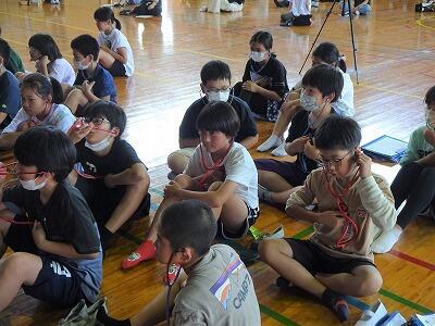6月19日(月)4校時、4年生は「櫂伝馬踊り」の現時点でのできばえを保存会の方に見ていただきました。「一番大切な元気のよい大きな声が出ていますね」とおほめの言葉をいただきました。口上の速さや各パートの動きについてもアドバイスをいただきました。今日のご指導をもとに、4年生のがんばりでよりよいものに仕上げていってくれると思います。
