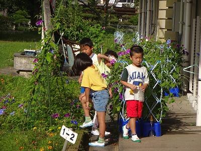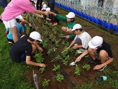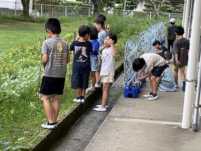 毎朝8時前に、1・2年生は自分たちが栽培しているアサガオやミニトマト、そして学級園の野菜に忘れずに「水やり」をしています。前日、雨が降っていたとしても、律儀に水やりをする1・2年生の姿はとてもほほえましいです。そのやさしい気持ちがきっと植物にも伝わるのだと思います。明日からもがんばって1・2年生!
