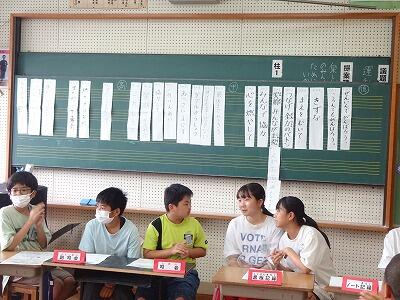 7月13日(木)6校時、代表委員会を行いました。今回の議題は「運動会のスローガンについて話し合おう」です。5、6年生の各クラス代表、運営委員会のメンバー、各委員会代表が音楽室に集まって、各学年学級から募集したスローガンキーワードの短冊をもとに話し合いを行いました。どんなスローガンができあがるのか、とても楽しみです。