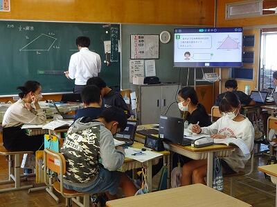 7月4日(火)3校時、5年2組で1年目の先生の研究授業がありました。算数科「合同な図形」の単元で、四角形の4つの内角の和について考える学習でした。子どもたちはグループで話し合いながら、三角計の内角の和180°をもとにしっかりと自分たちの考えを説明することができていました。