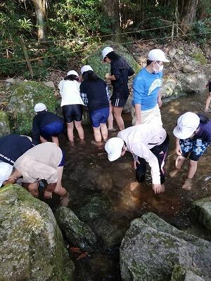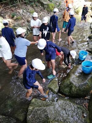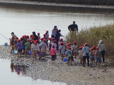 1年生はリバーパル五ヶ瀬川に歩いて行きました。グループごとにバケツとスコップを持って干潟で活動しました。