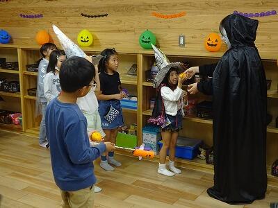 10月30日(月)16:00、校内にあるこばと第3東海東児童クラブからご招待いただいてて「ハロウィンパーティー」に参加させてもらいました。部屋に入るとたくさんのハロウィンの飾り付け、かぶり物やマントで仮装した子どもたちが先生の「ハロウィンのお話」の絵本の読み聞かせに耳を傾けていました。読み聞かせが終わったタイミングで、突然大きな音がして・・・子どもたち、驚きの表情でした。その後は「トリック・オア・トリート」で楽しい時間。児童クラブの先生方、ご招待いただきありがとうございました。