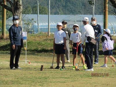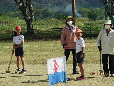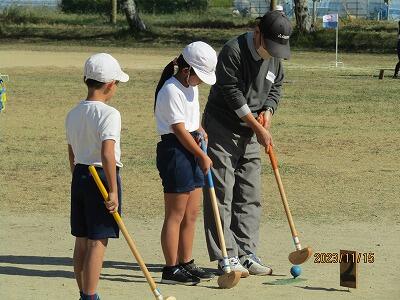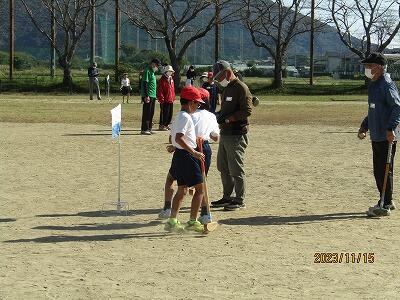 11月15日(水)に3年生が地域の方々とのグランドゴルフに挑戦しました。東海東地区社会福祉協議会の会員42名の方に来校していただき、2校時には3年1組、3校時には3年2組の児童と一緒にグランドゴルフを楽しんでいただきました。それぞれグループに分かれて、ルールや打ち方を教わりながら地域の方と楽しく交流することができました。各ホールから楽しそうな笑い声が聞こえていました。ご参加いただいた地域の皆様、ありがとうございました。