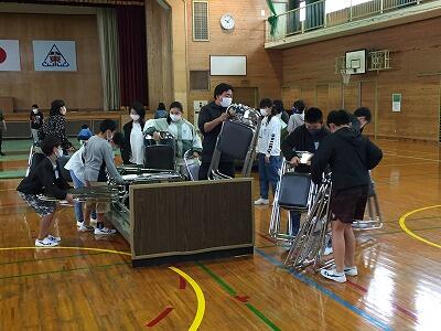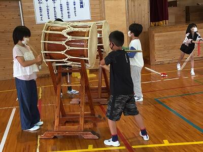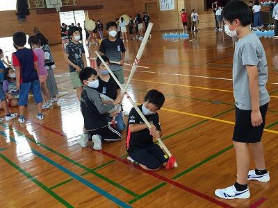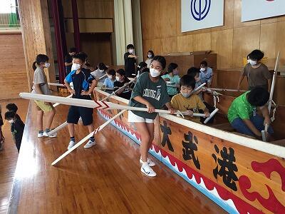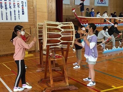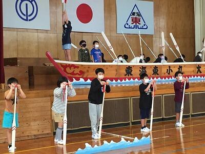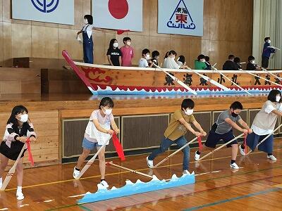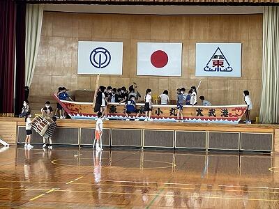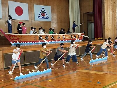 4月27日(水)1校時、体育館に「櫂伝馬踊り」の太鼓の音と「おもかーじ、とりかーじ、よーそろー」の声が響き渡りました。本校の伝統として保存会の方にもご指導いただきながら、毎年4年生児童に受け継がれている大武の「櫂伝馬踊り」です。今日は昨年度受け継いだ5年生が、新しい4年生に伝えるための練習を行いました。ブランクもあったせいか、昨年度の完成度からするともう一つでしたが、全員が気持ちを合わせて、4年生に伝える日までによりよい形に仕上げてくれると期待しています。がんばれ、5年生!