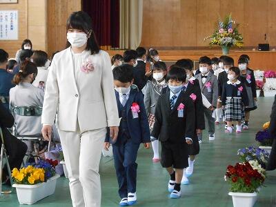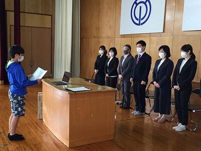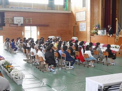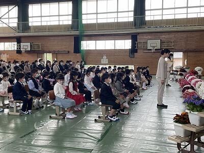 4月13日(水)第35回入学式です。雨が心配されましたが、式が始まる頃は薄日が差して、感染症対策で体育館の窓を開け放っていても、暑さを感じるぐらいの気候でよかったです。午前9時55分、46名のかわいい新入生たちの入場を保護者の方と職員が拍手で迎えました。本日6年生はリモートによる参加で、体育館で行われている式の様子を各教室で見守ってくれました。校長の「お祝いの言葉」の時には、6年1組のみんなに登場してもらい(声だけでしたが)、突然聞こえてきた6年生の声に新1年生は少々びっくりしていたようでした。氏名点呼ではしっかりと返事をして起立し、式の最後まで行儀よく参加することができた新1年生、とても立派でした。