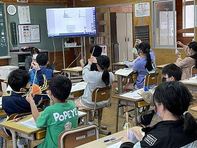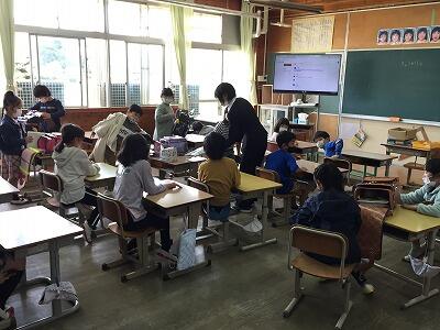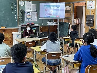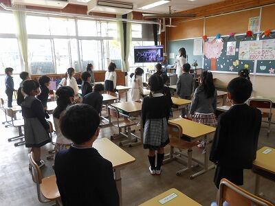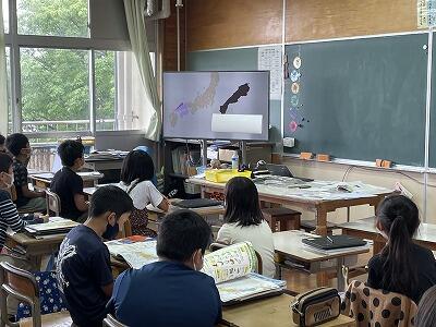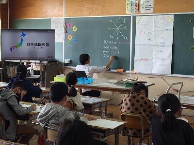 4校時、4年生の教室から元気な歌声が聞こえてきました。この時間は1組も2組も社会科の時間です。授業の前半に都道府県について知るために、2組は映像に合わせて都道府県名やその自然、特産が出てくる歌を歌いながら、1組はPCのクイズの問題に挑戦しながら盛り上がっていました。これからも全国47都道府県のそれぞれの特色に関心をもってくれたらと思います。