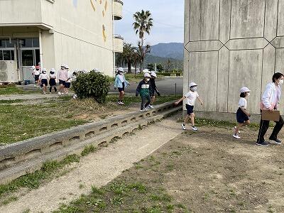 4月18日(月)新しい1週間がまた始まりました。朝の時間は、災害が起こった時のために各教室からの避難経路の確認を行いました。2年生は教室の掃き出し口から直接運動場の方に移動していました。5月には、この確認をもとに避難訓練も実施する予定です。