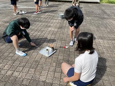 1・2校時、6年2組が理科で「ものが燃えるしくみ」について学習していました。火の燃え方と空気の関係について、「つどいの広場」で実験をしながら考えていました。子どもたちはとても興味深そうに取り組んでいました。