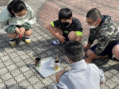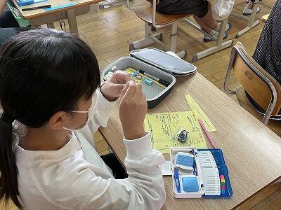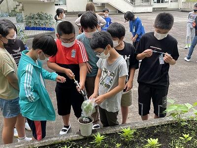 4年生は理科の「地面を流れる水のようす」の学習で、粒の大きさによる水のしみこみ方のちがいをペットボトルをつかった器具を使って、時間を計りながら実験をしていました。