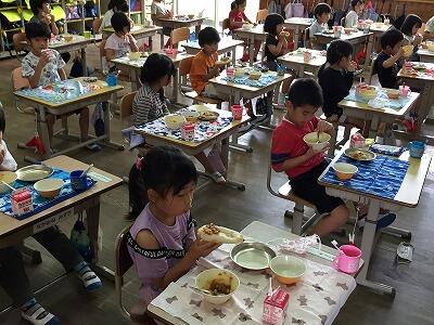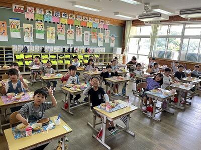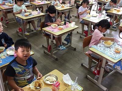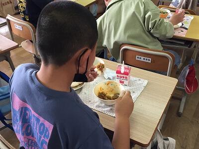 話は変わりますが、今日の給食は、「冷やし中華」とデザート「フルーツクラッシュ」とパンと牛乳でした。暑い夏でも食べられる子どもたちの大好きなメニューで、写真の5年生のようにみんなおいしそうに食べていました。