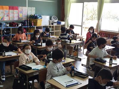 4月22日(金)3年生では国語の書写で毛筆の授業が始まりました。道具の準備の仕方、机の上の道具の置き方、筆の握り方や動かし方を学習し、いよいよ筆に墨を付けて横画から挑戦、鉛筆とは違った感覚に「難しい~」と声を上げる子どもたちもいました。筆の使い方に慣れてきたら、いろいろな文字にも挑戦していきます。がんばれ、3年生!