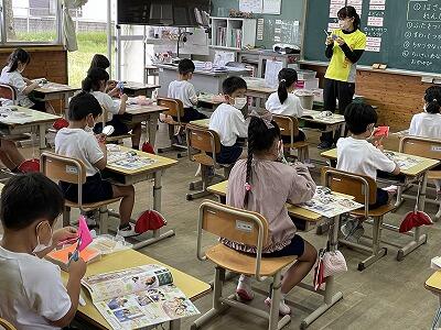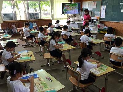 7月19日(火)3・4校時、4年生がクラスごとに、社会科でごみ処理についての環境学習に取り組みました。延岡市クリーンセンターからお二人の方をお招きして、クリーンセンターの施設や仕事について、4Rについて、ごみの分別について教えていただきました。特に、ごみ分別についてはカードを使って、ごみと資源物をさらに細かく分けた9つのグループに分けられるようにクラス全員で協力しながら考えました。今後の実践化につながるとてもよい学習でした。4年生がおうちの方と一緒にごみ減量化や分別など4Rに積極的に取り組んでくれることを期待しています。(写真は4年2組での授業の様子です)