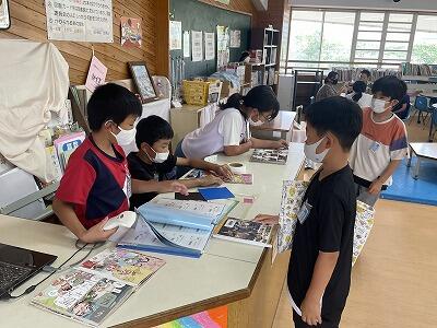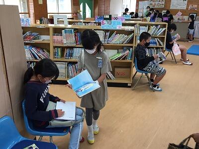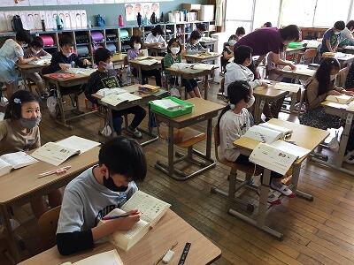 今週の昼休み時間から、図書室の本の貸し出しが始まりました。図書室カウンターでは図書委員会の5、6年生が交代で貸し出しのための手続きをがんばってくれています。本日4月28日(木)は3連休前ということで3冊借りることができます。2校時、3年2組の子どもたちが思い思いに本を選んで借りていました。連休中、ご家族でゆっくり本を読む時間を作っていただけるとありがたいです。同じ時間、4年1組は保健室で身体計測だったのですが、先に終わって教室に帰っていた子どもたちは、自分たちで教室にある本を選んで静かに読書をしていました。本校では「いろいろな隙間の時間には本を読むこと」に取り組んでいます。読書にはいいことがいっぱいです。ぜひ、学校でも家庭でも読書に親しんでほしいと思います。
