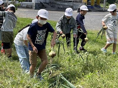 5月2日(月)5校時、3年生が2年生の頃に生活科で育てた玉ねぎの収穫作業をしました。以前このHPでも紹介しましたが、強い風のために一度苗を植え直しをした玉ねぎです。寒い冬を乗り越えて立派に成長し、とっても大きくなりました。大きな玉ねぎを畑から引き抜いて、子どもたちもうれしそうです。お味の方もきっと間違いないと思います!