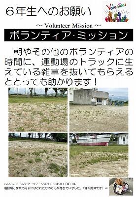 5月10日(火)です。季候もよくなり、ずいぶん校庭の草ものびてきました。運動場のトラックにも雑草が目立ち始めたので、昨日9日(月)毎朝ボランティア活動に取り組んでくれている6年生に、下のような「6年生へのお願い~ボランティア・ミッション~」を担任の先生から伝えてもらったのですが、今朝、さっそく実行してくれていました。とてもありがたいです。これからも頼りにしてます!6年生。