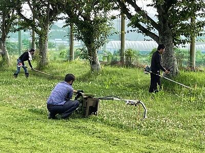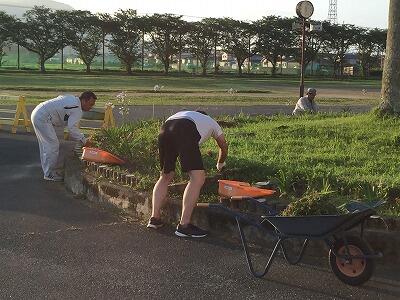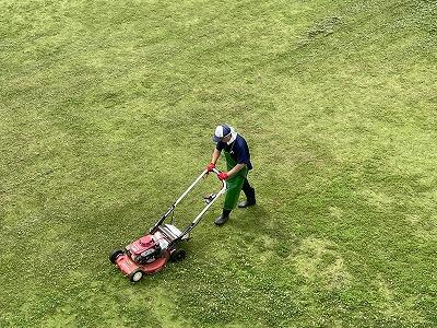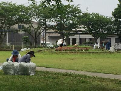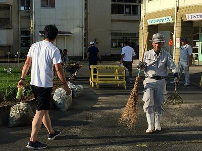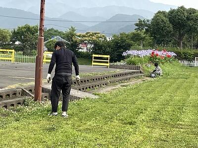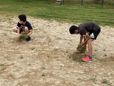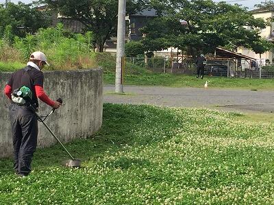 暑い中、運動場ではPTA施設厚生部長さんが草刈り作業をしてくださっていました。子どもたちのために、本当にありがとうございます。