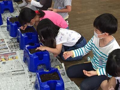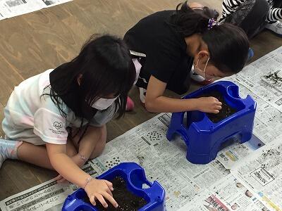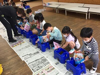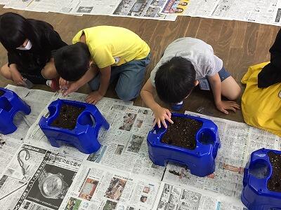5月12日(木)今日も朝から雨がずっと降っています。3校時、1年生は生活科の時間にアサガオの種まきをしました。あいにくの雨なので、教室横のオープンスペースと生活科室に新聞紙を広げて、1組・2組いっしょに活動しました。土を入れて、肥料を入れて、指で土に穴を開けて、種を入れて・・・・。先生の説明を聞きながら、みんな上手に作業を進めていました。芽が出てくるのを楽しみに待ちたいと思います。