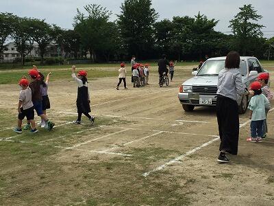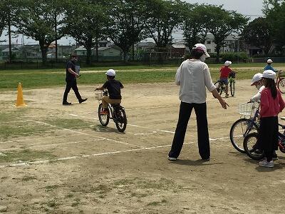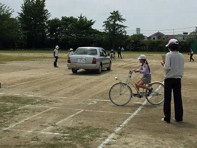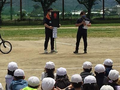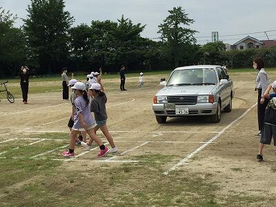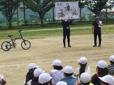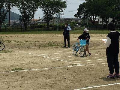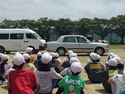 5月17日(火)3~5校時、2学年ごとに交通安全教室を実施しました。今回は市内の延陵自動車学校さんから4名の指導員の方をお招きして、道路での歩き方、自転車の乗り方についてご指導いただきました。まずは1、2年生。信号の赤、青の意味について教えていただいたり、横断歩道の待ち方、渡り方、歩道の歩き方について実際にやりながら学びました。ダミー人形を使っての車の衝突実験では、その衝撃にびっくりしたようでした。3・4年生、5・6年生は自転車での道路の通行の仕方、点検の仕方について、丁寧にわかりやすく教えていただきました。自分の命、そして自分の周りの人の安全のためにも、今日学習したことを即実践してほしいと思います。