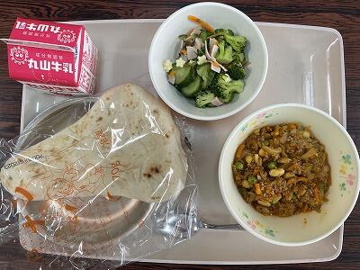 さて、今日は1年生にとって初めての給食でした。献立は「牛乳、コッペパン、スパゲティナポリタン、チーズサラダ」です。1組も2組も、おいしそうに食べている様子が見られました。