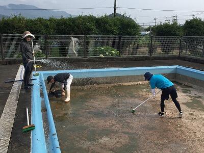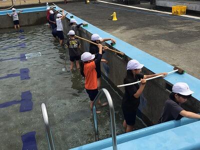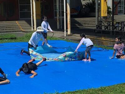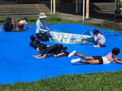 外は今日も暑いです。夏休み児童クラブの子どもたちが中庭にブルーシートを敷きミニプールを出して水遊びを楽しんでいました。気持ちよさそうでした。運動場近くでは、連日の暑さでぐんぐんのびた草を技術員さんがきれいに刈ってくれていました。お疲れ様です。